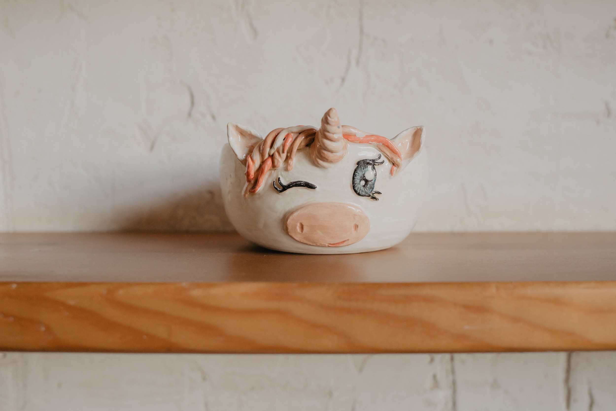 После всех технических сборов порядочных единорогов полагается раскрасить всеми цветами радуги, что дети с удовольствием и делают. Раскрашивают мордочки, гриву, уши, хвост специальными безвредными красками. А внутри выбирают яркую глазурь, который мы покроем после первого обжига.