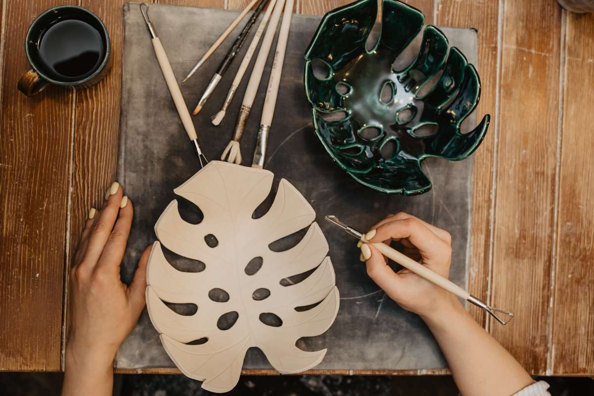 На этом мастер-классе мы используем технику пласта: раскатываем большой кусок глины, делаем пласт ровным и гладким. Далее рисуем лист монстеры - ее форму, изгибы, отверстия. Далее вырезаем, тщательно разглаживаем все края, придаем форму и наносим узор.